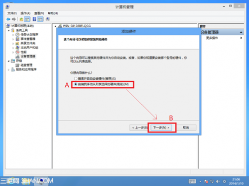 如下图A-B顺序,选择“安装我手动从列表中选择的硬件(高级)”,然后点击下一步;