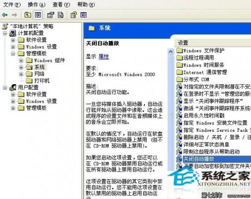 2、在左栏的“本地计算机策略”下,打开“计算机配置——管理模板——系统”,然后在右栏的“设置”标题下,找到“关闭自动播放”