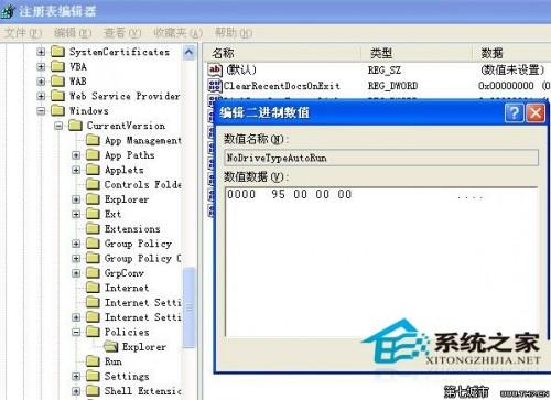 2、在注册表编辑器里找到HKEY_CURRENT_USER/Software/Microsoft/Windows/CurrentVersion/Policies/Explroer主键下,找到“NoDriveTypeAutoRun” 右键点击并选择“修改二进位数据”将值改为“95 00 00 00”;