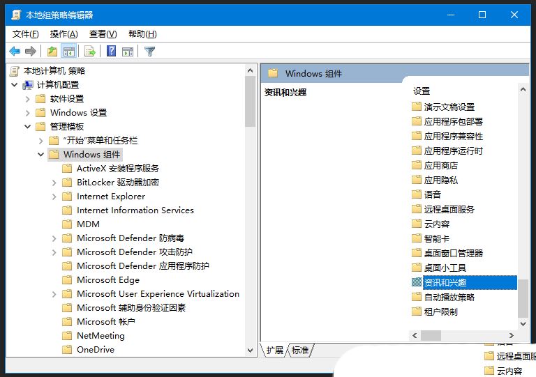 2、本地组策略编辑器窗口中,依次展开到【计算机配置 > 管理模板 > Windows 组件】,然后在右侧,找到并双击选择【资讯和兴趣】;
