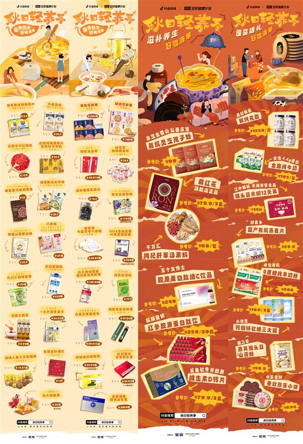 活动之初,「抖in全民健康计划·秋日轻养季」便发布了一套“好物榜单”,针对居家厨房、即食补充、囤货送礼和滋补养生这四大健康消费需求,为消费者提供了明确的购物指导。榜单推荐涉及了乳制品、坚果、中式滋补、保健品、麦片冲饮、生鲜等众多类目,全方位覆盖着健康消费需求。